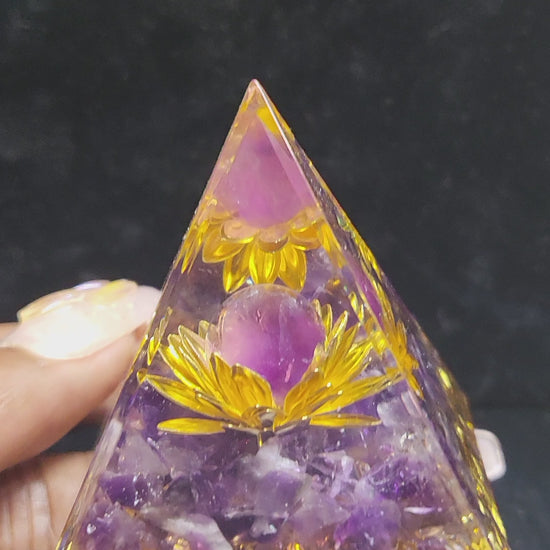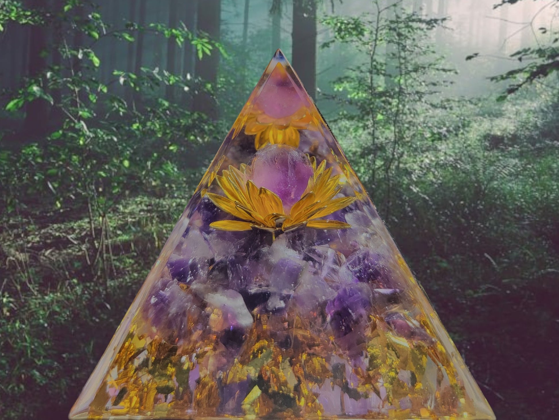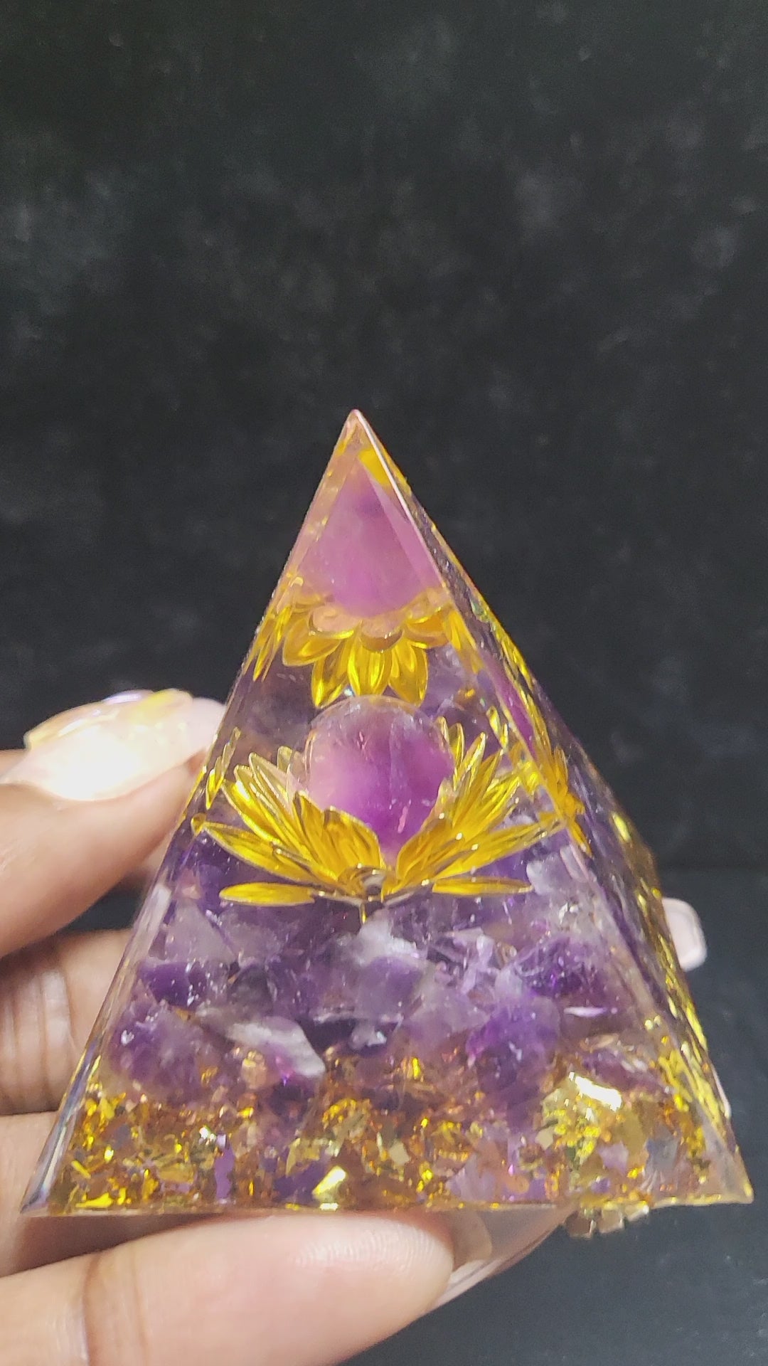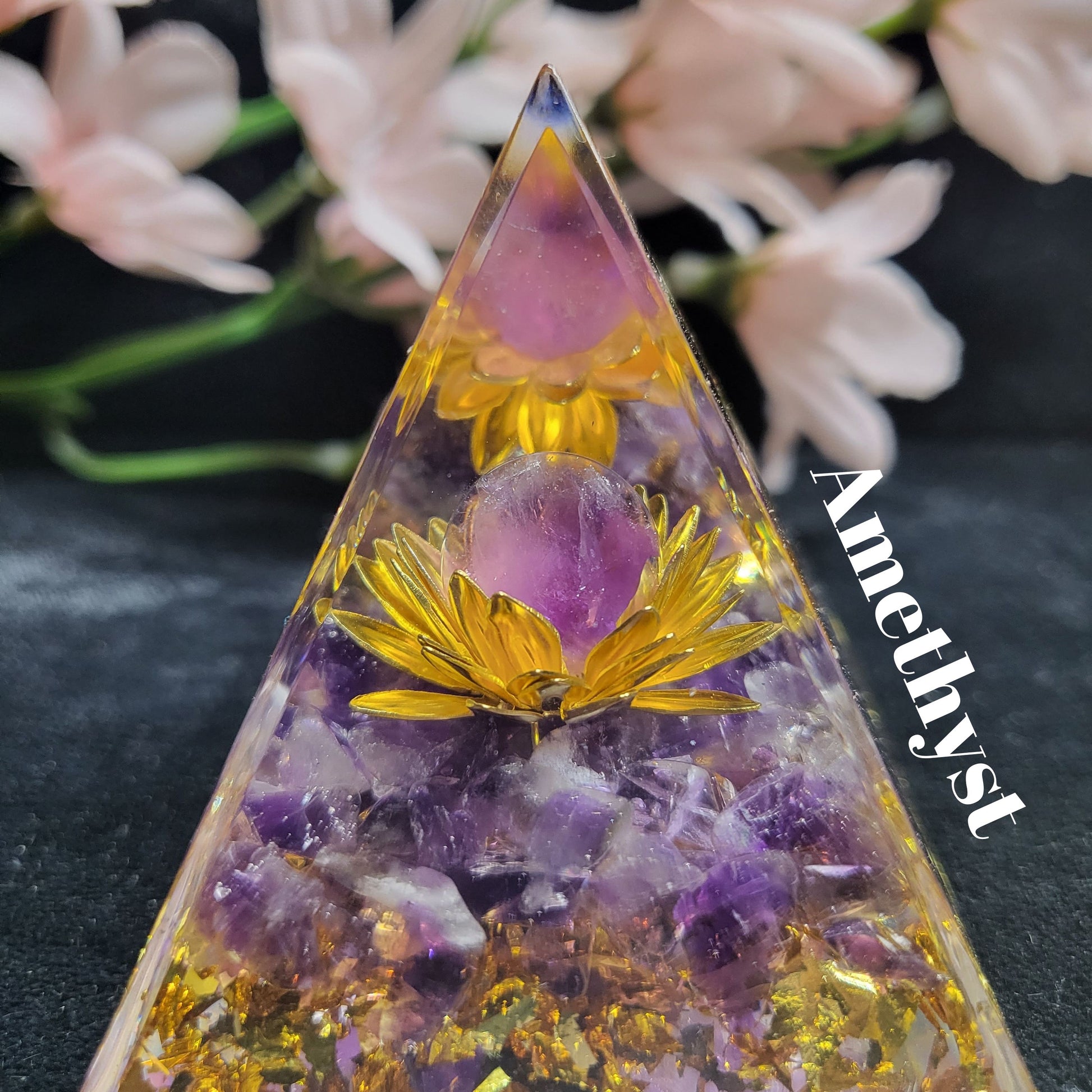 Step into a realm of holistic harmony with our Assorted Flower Resin Orgone Pyramid adorned with Natural Gemstones. A fusion of ancient wisdom and modern craftsmanship, each pyramid is a masterpiece of energy-balancing artistry. At its core lies a harmonious blend of resin and gold metal shavings, meticulously layered to create a matrix that harmonizes and balances subtle energies.