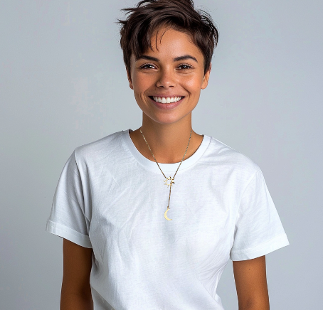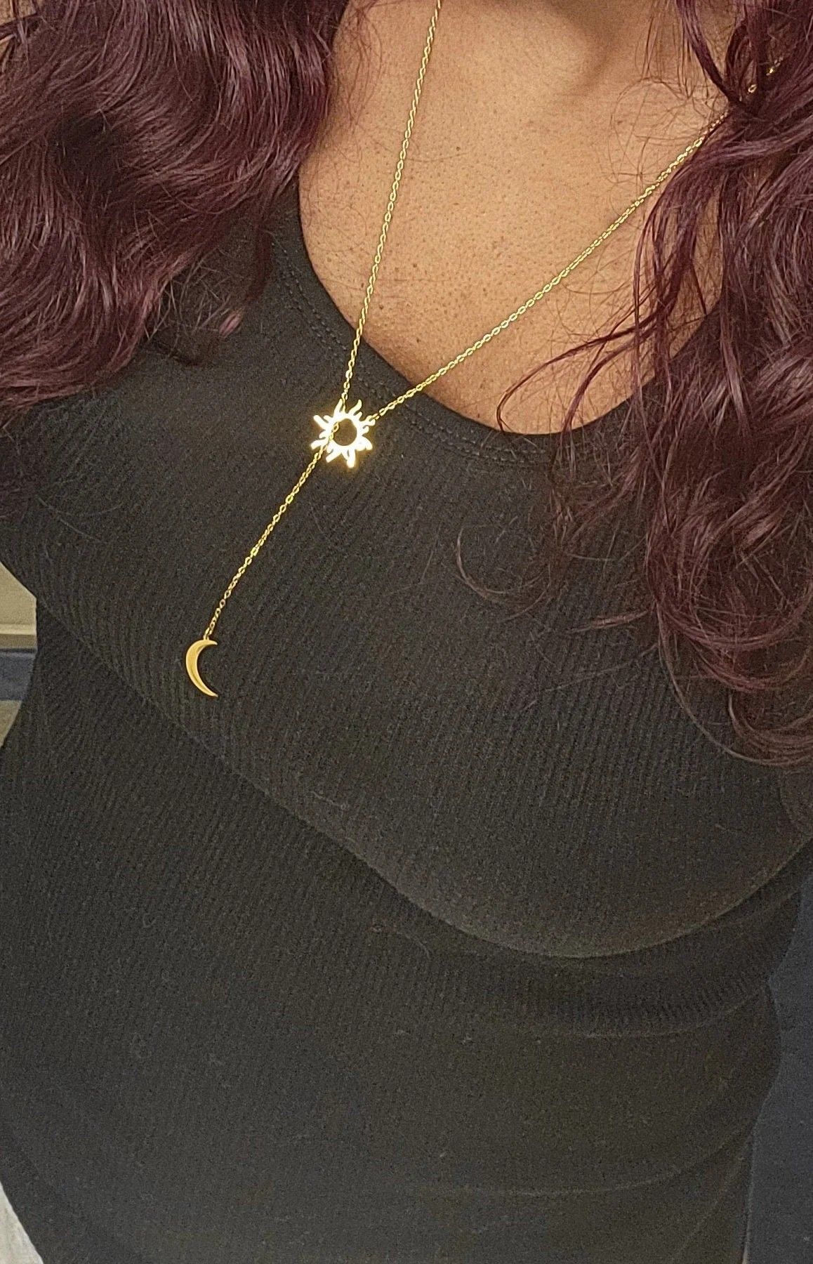 This versatile necklace is perfect for any occasion, whether you're dressing up for a night out or adding a touch of elegance to your everyday look. It can be worn multiple ways as shown! Its timeless design makes it a thoughtful gift for loved ones or a beautiful addition to your own jewelry collection. Enjoy the allure of the cosmos with the Sun & Moon Adjustable Lariat Necklace.