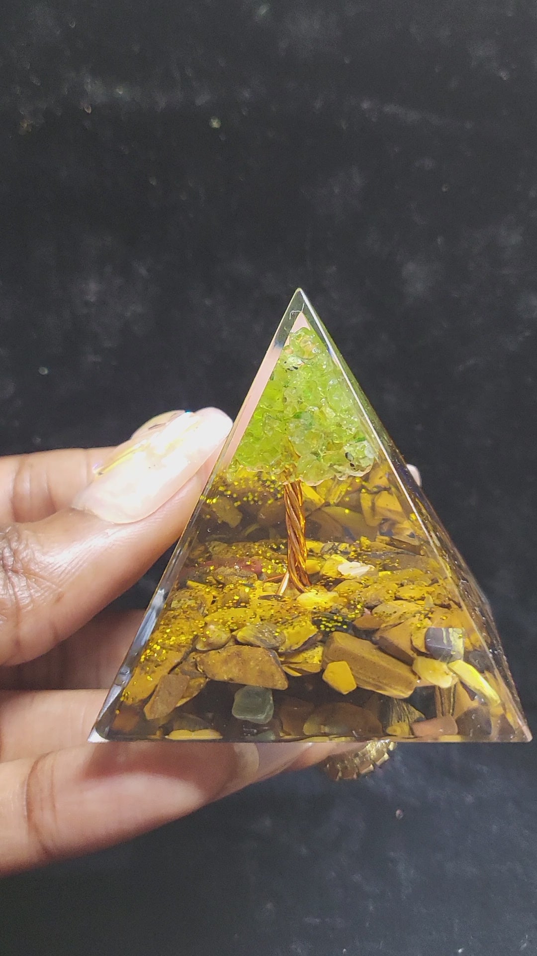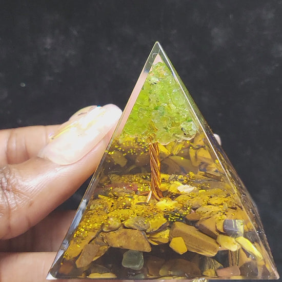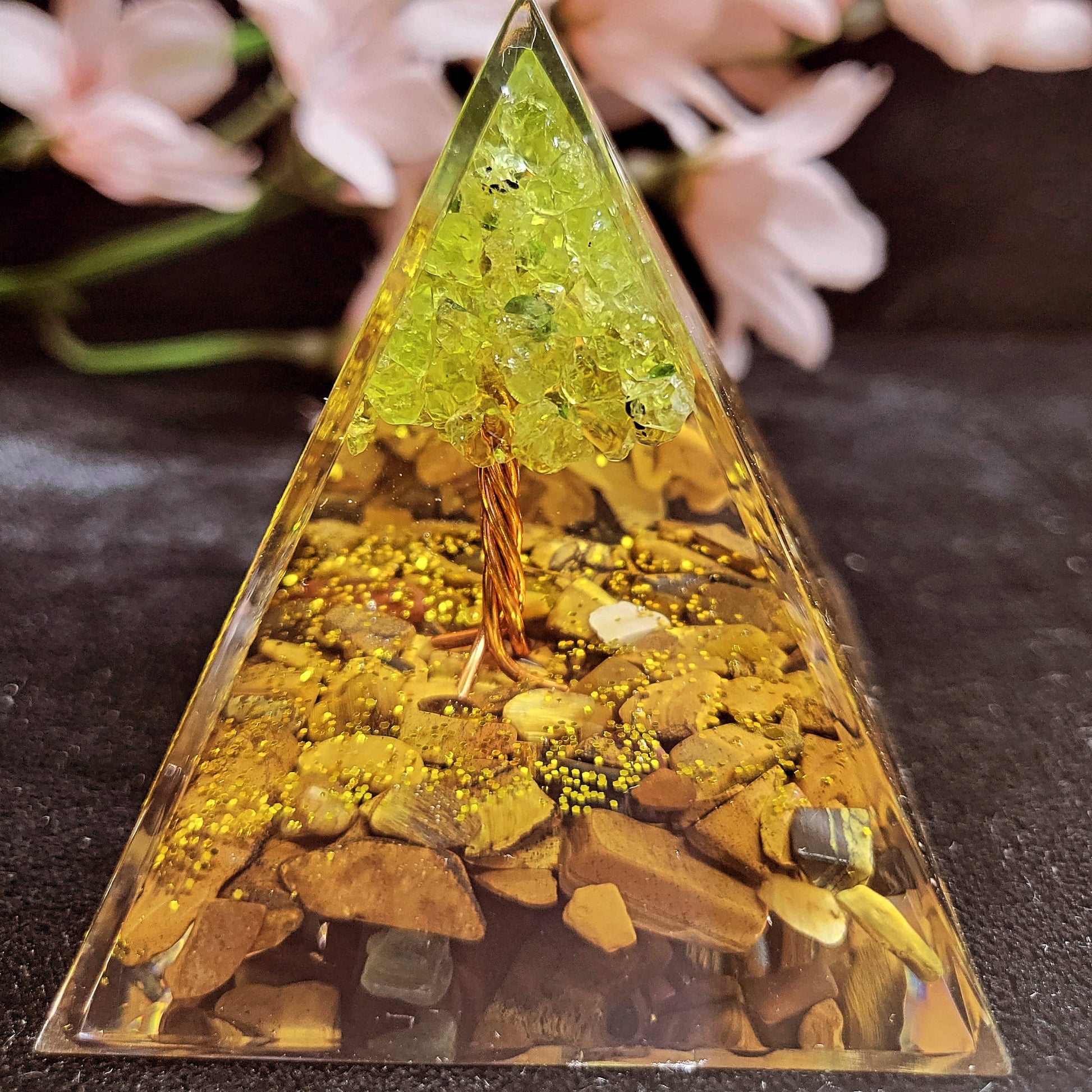 Tree of Life Resin Orgone Pyramid with Tiger Eye and Peridot Gemstones- Reiki Healing, Meditation, Energy Cleanse, Stress Relief